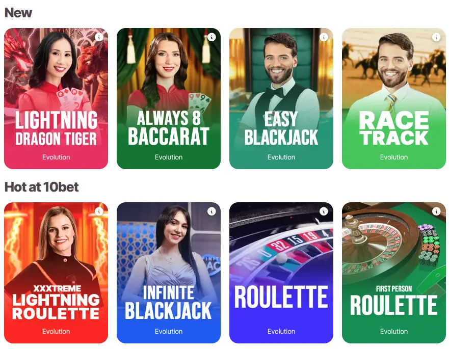 There are more than 80 live dealer games, and game shows available at 10Bet. This includes high-quality titles from Evolution Gaming and low-data games from BetGames. Their live dealer game library is not massive but covers every game type, from classic table games to game shows and quick games.