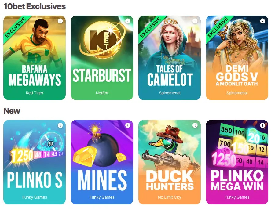 The list of casino games you can play at 10Bet is impressive – and very well organized. It has a list of more than 1,100 titles in its Games section, most of them slot machines and some mini-games. Their game library is a mix of games from big names like Pragmatic Play, NoLimit City, Red Tiger and Spinomenal, to smaller studios like Netgaming, EGT Digital, Funky Games or Amusnet. There are even a few exclusive titles listed, like a 10Bet-branded Starburst and the Bafana Megaways slot.