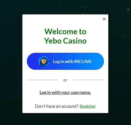 Yebo Casino uses Inclave for access control. This third-party service works a lot like a password manager and all-in-one solution to access a handful of online casinos, including Yebo.